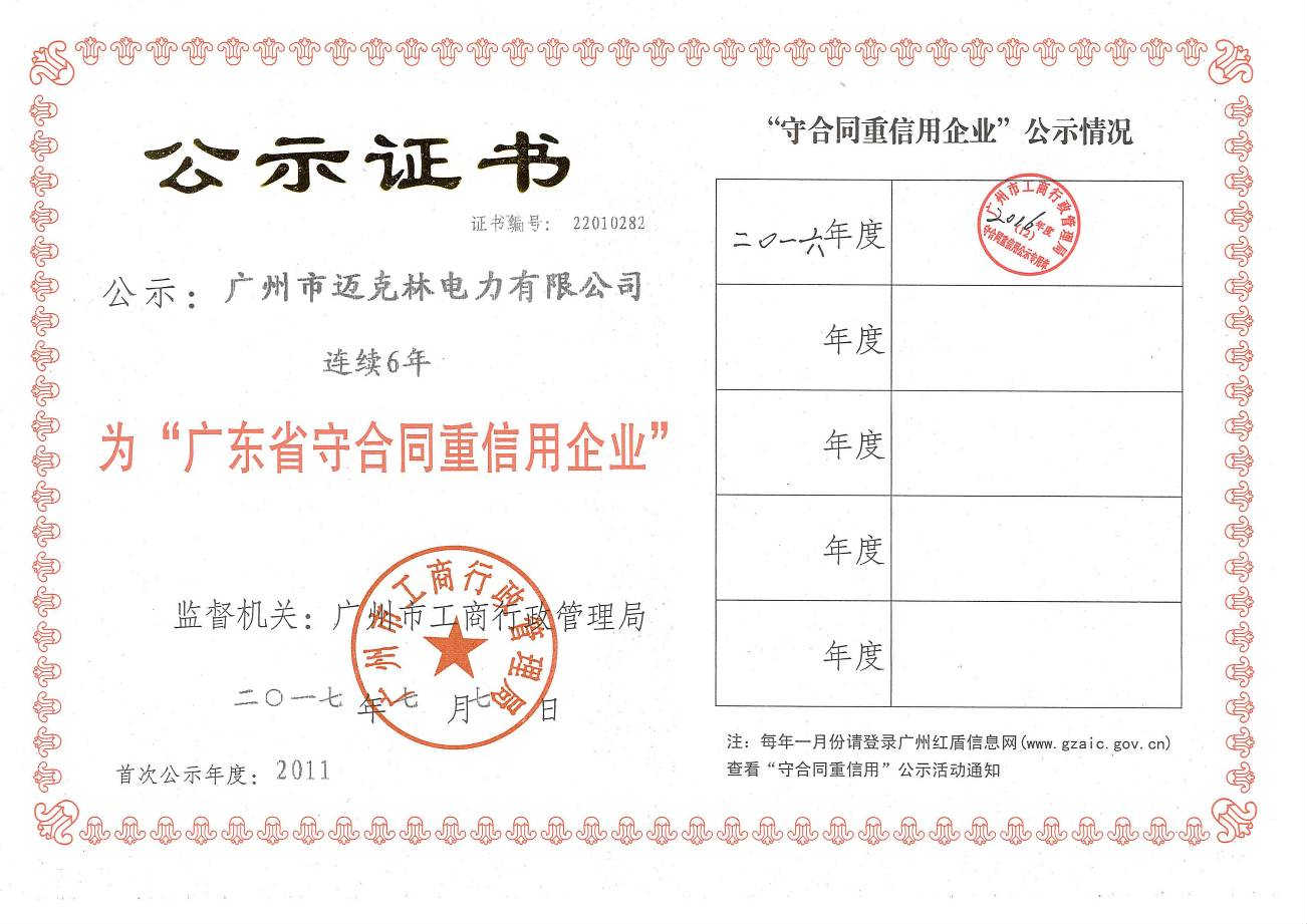廣東省守合同重信用企業(yè)公示證書2016年度